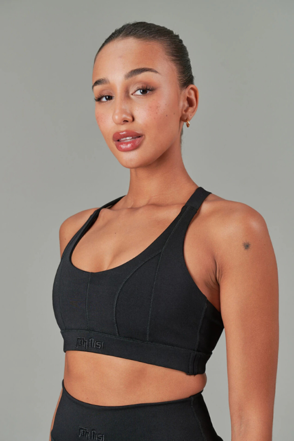 Top deportivo con escote cerrado y espalda cavada. Costuras visibles que aportan estructura, elastico firme en bajo busto para un agarre ideal para entrenamientos intensos. El top está forrado. No posee tazas. Composición: 70% elastano, 30% poliéster.
